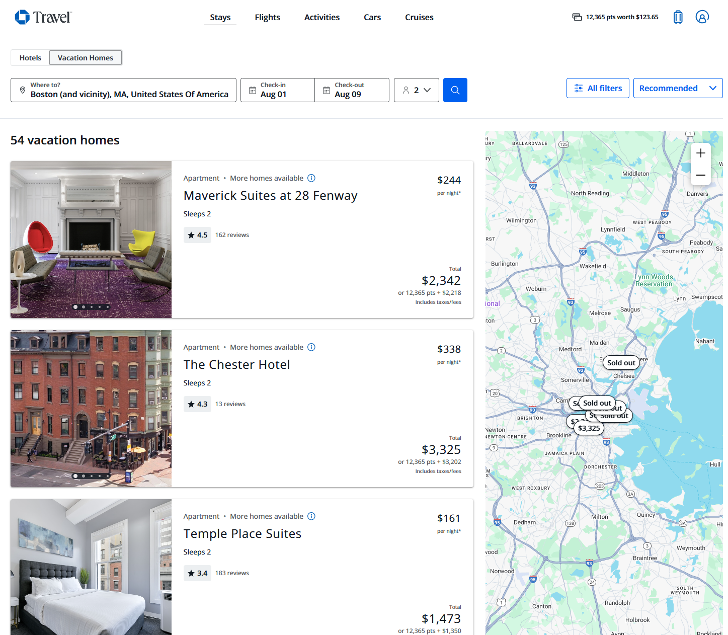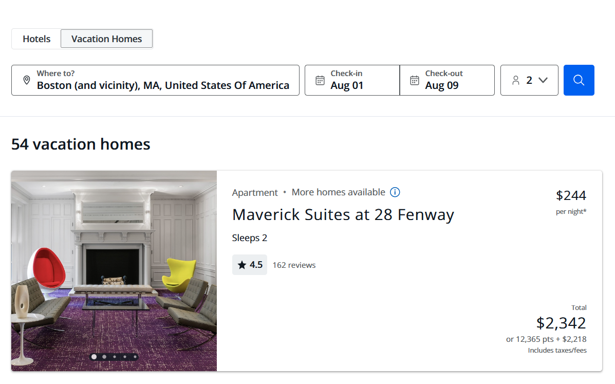 For testing purposes, we searched for vacation rentals in Boston in early August. For each search result, we saw multiple images of the property, the rental type (apartment, etc.), how many guests it could accommodate, the nightly cash price and the all-in price in both cash and Chase Ultimate Rewards points.