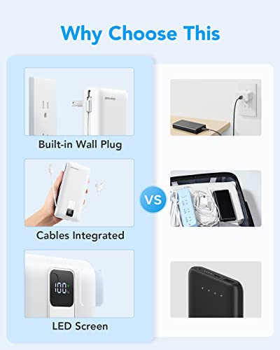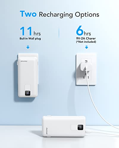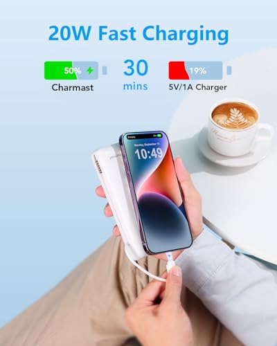 Portable Charger with Built-in Cables and Wall Plug: Two cords and wall plugs integrated allows the Charmast power bank to be compatible with all cellphones, so you don’t need to bring extra chargers or get frustrated with a tangled mess of wires.