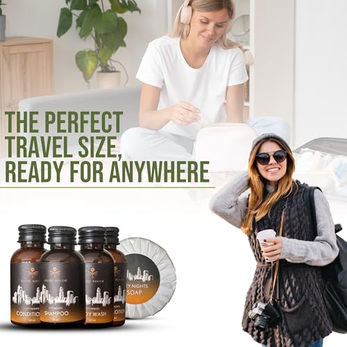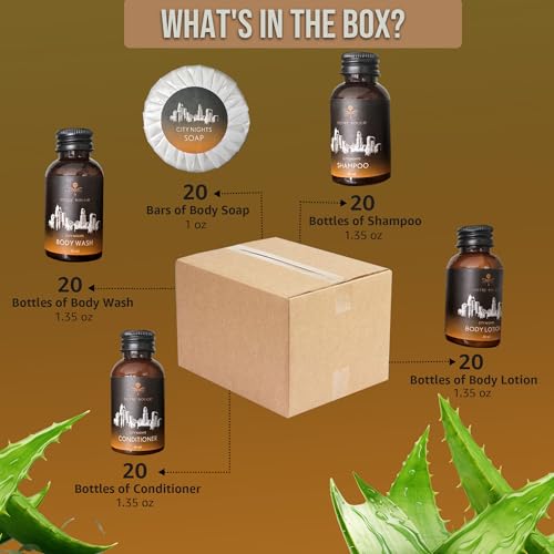 City Nights Travel Size Toiletries Bulk – Luxurious Hotel Amenities & Guest Essentials | 1.35 oz Shampoo, Conditioner, Body Wash, Body Lotion and 1 oz Bar Soap | 100 pieces | 20 Sets
