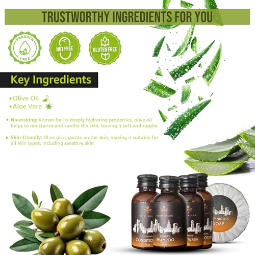 Gentle Hydration Formula for Everyone: This bulk toiletries set combines olive oil and aloe vera to provide a gentle nourishing experience. Tailored for Airbnb guests, these hotel amenities ingredients meet high standards of quality and are paraben free, nut free, and gluten free.