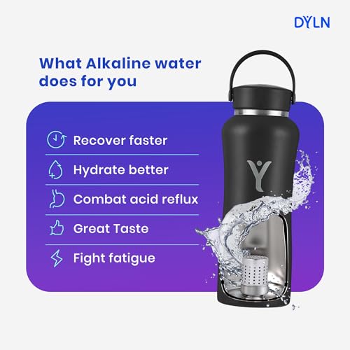 CREATES ALKALINE WATER: Transform your water into high-pH Alkaline Water within minutes with the DYLN reusable insulated water bottle; The replaceable Diffuser (lasts up to 250 refills/300 L) increases the pH up to 9.5 and reduces the ORP down to -150 to make your water alkaline and antioxidant; It also makes your water hydrogen-rich