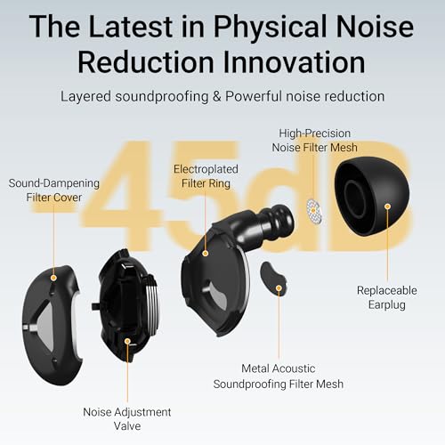 HIGH-EFFICIENCY NOISE REDUCTION: Ear plugs for sleeping feature advanced multi-layer noise reduction, breaking away from conventional design to effectively reflect and absorb sound waves. With their efficient adjustable capabilities, ear plugs can achieve up to 45dB of noise reduction, blocking out high, mid, and low frequencies for a peaceful environment in noisy surroundings