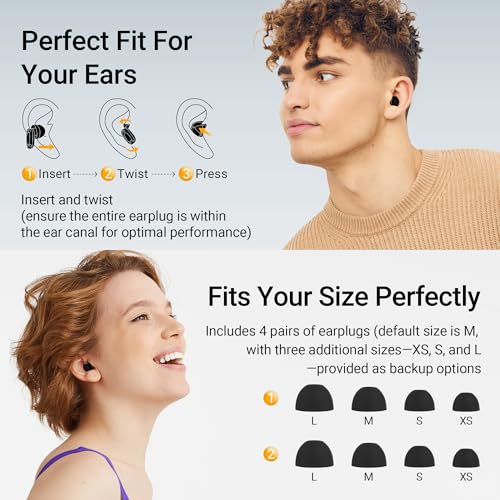 SOFT AND COMFORT: These noise cancelling ear plugs are ergonomically designed with soft food-grade silicone ear tips for a comfy fit. They’re perfect for sleeping or long stays in noisy places without causing discomfort. The sleeping ear plugs come with four ear tip sizes—XS, S, M, and L (with M as the standard)—to suit your needs