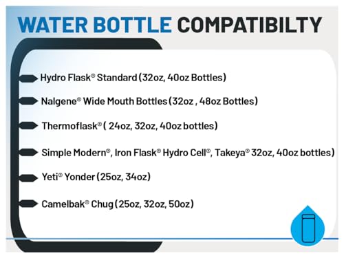 Compatible with wide mouth Hydro Flask 32oz & 40oz, Nalgene 24oz, 32oz & 40oz, Camelbak Chug 25oz, 32oz, 50oz, Yeti Yonder 25oz, 34oz, Iron °Flask 32oz & 40oz, Simple Modern 32oz & 40oz, Thermoflask 24oz, 32oz, 40oz, Hydro Cell 32oz, 40oz, and Takeya 32oz & 40oz bottles.