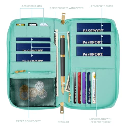 ★【Family Passport Wallet】: Features 6 passport holders,5 card slots,1 zipper coin pocket,2 side cash pockets,3 SD card slots,1 pen slot,1 front boarding pass pocket,1 back zipper pocket for your phone(less than 6.5″) or any other tickets. Roomy and multiple,perfect travel passport wallet for family.