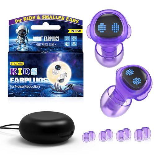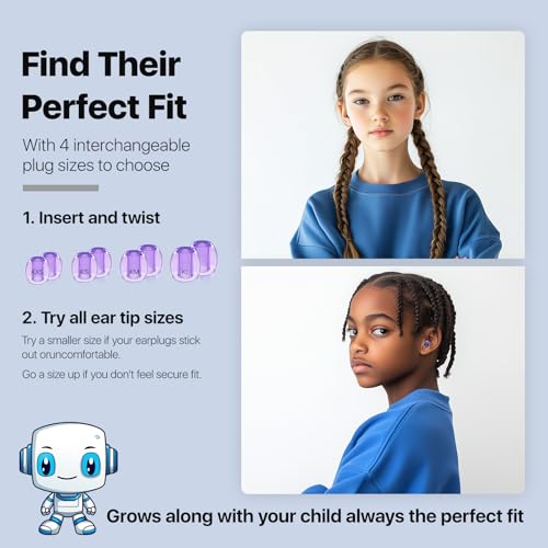 [CUSTOMIZED FIT]: With 4 interchangeable ear tip sizes to choose from(KXS, KS, KM,KL) – Extra Small; Small; Medium; and Large for snug fit every time, these noise reduction earplugs will grow with your kids. They are easily switched out when necessary. COMFY-FIT FOR KIDS AND SMALL EAR ADULTS