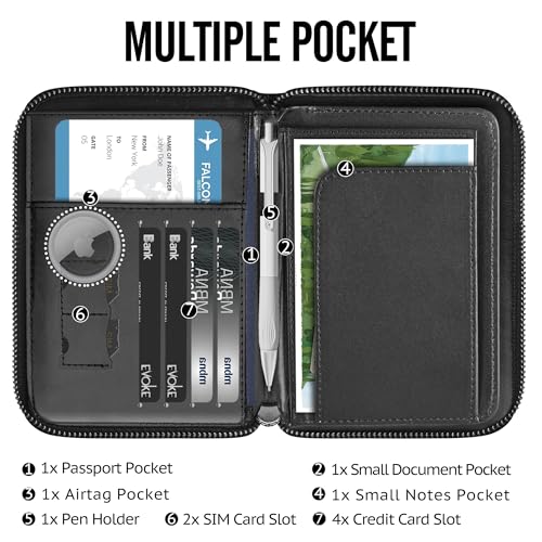 【Ultra Large Storage Capacity】: Our passport holder offers an exceptional level of organization with its thoughtfully designed compartments. With 3 passport pockets, 2 SIM card slots, 4 credit card slots, 1 spacious document pocket, 1 airtag pocket, and even 1 pen holder. Stay effortlessly organized while accessing your essentials with ease.