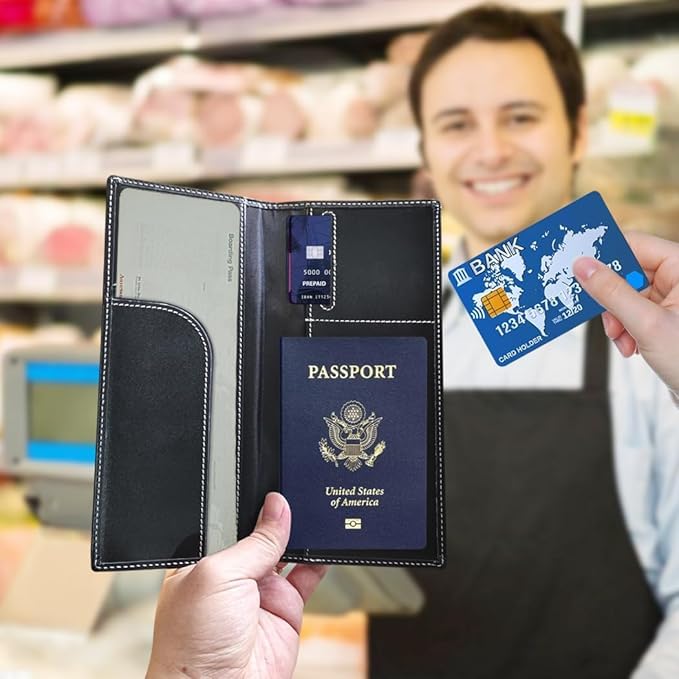 This slim minimalist long passport holder made of genuine leather with RFID blocking function which protect your cards from unauthorized scanning. It contains a cash slot, a boarding pass slot, a card slot and passport holder slot which helps you organized all your essential items during your trip , so that make your trip easier and more superior.